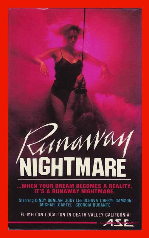 Runaway Nightmare began as a three-quarter finished first draft that was rushed into production by a CinemaCarnaval director when a once-in-a-milinium event arrived. With a weekend pre-production and a horrific 3-week shooting schedule that stretched into two years, Mike Cartel labored with it another year in pre-production until it finally arrived as a 8460-foot answer print. Contracted with one distributor that sub-contracted it to another that added unauthorized nudity and released as one of the first straight-to-videos, Runaway Nightmare developed a fiercely loyal cult following. Actor/director/writer/producer/editor/gofer and opportunist Mike (shoot it first and rehearse it later) Cartel, who had worked earlier in the majors as an actor and extensively in low-budget and deferment schools of filmmaking was approached in 2013 for his thoughts on a restoration and new DVD ‘director’s cut’ release of RN. In early July, 2014, the new Runaway Nightmare arrived in DVD, Blu-ray, retro-VHS and even its first ever 35mm film print for national theatrical release.